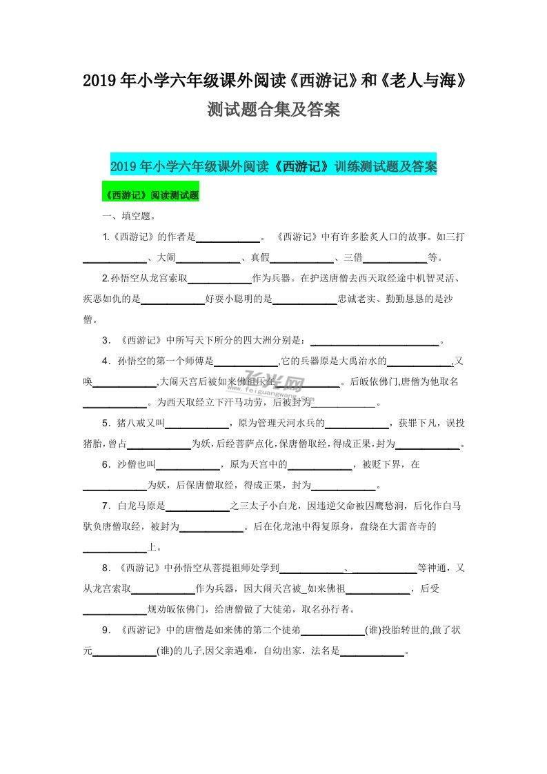 2019年小学六年级课外阅读《西游记》和《老人与海》测试题合集及答案.docx