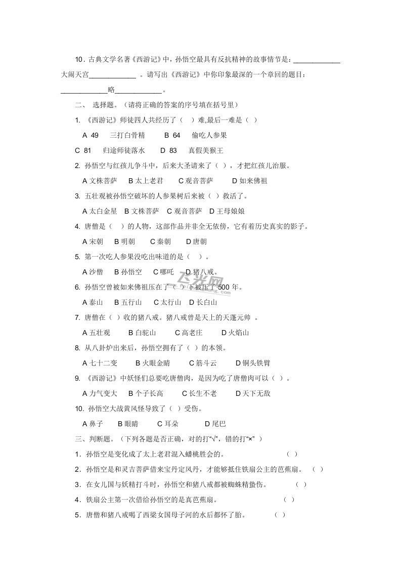 2019年小学六年级课外阅读《西游记》和《老人与海》测试题合集及答案
