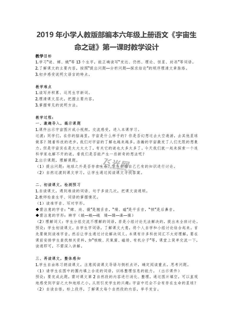 2019年小学人教版部编本六年级上册语文《宇宙生命之谜》第一课时教学设计.docx