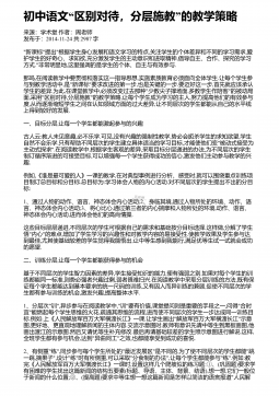 “”初中语文区别对待,分层施教的教学策略来源:学术堂作者:周老师发布于:2014-11-24共2987字"新课标"提出"根据学生身心发展和语文学习的特点,关注学生的个体差异和不同的学习需求,爱护学生的好奇心、求知欲,充分激发学生的主动意识和进取精神,倡导自主、合作、探究的学习方式."非常明显地,这里强调的是学生的个体、自主与有效参与.那吗,在阅读教学中要贯彻和落实这一指导思想,实施素质教育必须面向全体学生.让每个学生参与到教学活动中,是"新课标"要求改进的第一步,也是关键的一步.要迈好这一步,首先就应该承认学生的差异.为此,在课堂教学中,必须改变过去那种"少数尖子撑场面,多数学生作陪客"的被动...