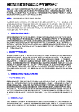 国际贸易政策的政治经济学研究研讨摘要:本文主要针对国际贸易政策的政治经济学研究为重点进行分析,结合当下政治经济学意义为依据,从经济学理论出发具体围绕经济学寻租和经济活动、贸易政策工具的选择、贸易政策决定者三个方面进行阐述,其主要目的在于探索国际贸易政策的政治经济学发展方向,为提高国内政治经济政策的实施方向选择奠定坚实的基础。关键词:国际贸易政策,政治经济学研究,具体应用当前我国经济已经和国际接轨,所以国际经济政策的调整对我国经济也会产生一定的影响,对国际贸易政治经济学的研究能够提高我国经济在国际经济市场中的竞争地位。国际贸易政策的调整主要与国际的政治格局的调整紧密相连,正确掌握国际贸易政策,了...