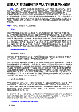 青年人力资源管理问题与大学生就业创业策略 摘要:当代社会背景下,随着市场竞争形势的加剧,大学生的就业形势越来越严峻,如何提高当代大学生的就业率,增强当代大学生各方面的素质与能力,从而提高创业成功概率,已经成为当代社会与高校教育亟须解决的重要问题。而影响大学生就业与创业的因素主要有以下几点:大学生就业中心受政府的支持力度、有关大学生就业与创业的相关政策、用人单位与企业对人力资源的开发配置水平以及高校对大学生就业和创业的重视程度等。当代社会如何提高大学生的就业和创业能力与水平,应从以上观点出发,结合当代大学生的实际情况,对其进行合适的就业、创业指导,完善大学生就业与创业指导工作并结合青年人力资源...