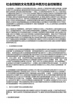 社会控制的文化性质及中西方社会控制理论社会控制是一个有着悠久历史的话题,然而,很长一段时间人们将秩序视为理所当然的事,"总的看来,我们可以有把握地说,直到战争和掠夺活动结束他们的原始共产主义之前,原始人把秩序视为理所当然的事,这种品质达到异常的高度."①事实上,社会秩序很早就存在.所以,当人们意识到这个问题的时候,或是说,当人们在讨论社会控制时,其重点关注就是社会秩序,社会控制的根本目的就是建构和维护社会秩序",从19世纪的孔德对社会秩序混乱感到的恐惧到迪尔凯姆的社会'失范'与整合,再到当代美国的帕森斯及其追随者罗伯特·金·默顿以维持社会稳定作为自己理论目标所进行的结构功能分析,无一例外将社会...