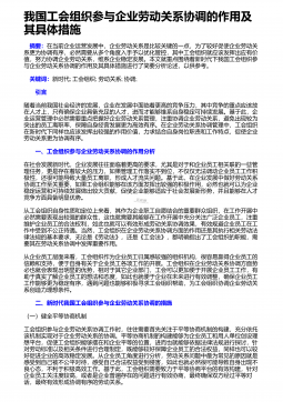 我国工会组织参与企业劳动关系协调的作用及其具体措施 摘要:在当前企业运营发展中,企业劳动关系是比较关键的一点,为了较好促使企业劳动关系更为协调有序,必然需要从多个角度入手予以优化管控,其中工会组织就应该发挥出应有价值,努力协调企业劳动关系,维系企业稳定发展。本文就重点围绕着新时代下我国工会组织参与企业劳动关系协调的作用及其具体措施进行了简要分析论述,以供参考。 关键词:新时代;工会组织;劳动关系;协调; 引言随着当前我国社会经济的发展,企业在发展中面临着更高的竞争压力,其中竞争的重点应该放在人才上,只有确保企业具备充足的人才,进而才能够维系自身稳定可持续发展。基于此,企业运营管理中必然需要重...