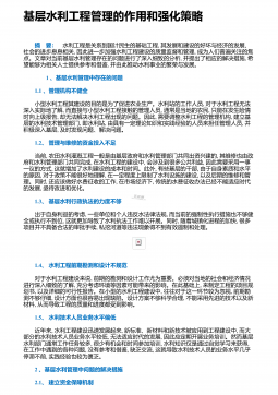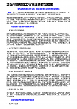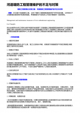 河道堤防管理存在的不足与提升策略堤防工程管理论文第八篇:河道堤防管理存在的不足与提升策略 摘要:针对当前河道堤防管理存在的问题,包括管理水平差距较大、管理难度相对较大、管理维护经费不足、管理人员思想懈怠等,提出包含强化组织领导,注重堤防工程创建与完善管理制度,强化法律法制建设等在内的堤防管理对策。如今,河道堤防的作用已不仅仅局限于防洪减灾,在环境保护、绿化等方面也有越来越重要的作用,这也在很大程度上提高了堤防工程管理难度,由此暴露出许多管理问题,需要在实际工作中采取有效对策,提高管理水平。 1 河道堤防管理存在的问题1.1管理水平差距明显近年来,各地堤防工程从日常维护工作着手,严抓管理,使...