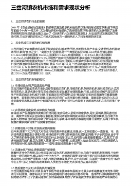三岔河镇农机市场和需求现状分析1、三岔河镇农机行业的发展2004年《农业机械化促进法》的颁布实施及把农机补贴政策以法律的形式固定下来,接下来历年的数个中央"一号文件",又为各地农机补贴提供了良好的政策环境,使农机化发展得到了法律的保障和支持,陆良县也随之出台了《加快农机化发展的实施意见》,对全县农机发展起到了推动作用,三岔河镇的农机化工作也和其他地方一道悄然步入了科学发展的快车道.2、农业机械在本镇的地位和作用三岔河镇位于云南最大的高原平坝陆良的东部,地势平坦,土地肥沃,物产丰富,交通便利,水利基础条件好,素有"鱼米之乡"、"高原水乡"的美誉,是一个典型的农业大镇,人口大镇.全镇总面积121....