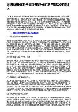 网络新媒体对于青少年成长的利与弊及对策建议近年来,互联网信息技术快速变革,智能手机和移动互联网的普及使得网络突破了空间的限制,人们能够在任何地方和时间连接和访问互联网。互联网技术的快速发展给人们的生活、娱乐、工作、学习带来了全新的体验,微信、微博、短视频、社交网络等网络新媒体迅速普及。根据中国互联网络信息发布的数据,截至2018年12月,我国互联网用户规模达到8.29亿,互联网普及率达到59.6%,其中,19岁以下网民占网民总规模的21.9%。青少年处于身心成长和发育的关键阶段,网络新媒体为青少年获取信息提供了便捷的方式,改变了青少年交流、分享和表达的方式,但与此同时,青少年处于成长叛逆期,容...