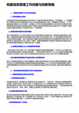 档案信息管理工作问题与创新策略 一、档案信息管理工作中存在的问题 (一)信息管理技术落后当前我国的档案信息管理模式还相对落后,大多数单位都采用传统的人工管理模式。人工管理相对于智能来说,很多方面都表现出不足,比如信息管理体制不完善、管理模式不健全等。人工管理模式虽然更具人性化,但是在一定程度上,并不利于档案信息管理工作的开展,比如需求者在选择想要查询的档案时,落后的检索技术不能及时查询到有用的信息,而档案又多,不可能挨个查看,这就对档案信息管理工作的展开带来了一定的阻碍。 (二)档案信息环境的安全受到威胁首先,档案的管理工作上缺乏法律作为安全保障,我国还没有建立统一的档案信息管理网站,各类...