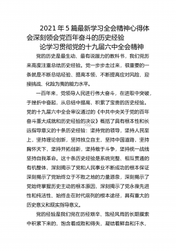 2021年5篇最新学习全会精神心得体会深刻领会党百年奋斗的历史经验论学习贯彻党的十九届六中全会精神党的历史是最生动、最有说服力的教科书,我们党历来高度注重总结历史经验。党一步步走过来,很重要的一条就是不断总结经验、提高本领,不断提高应对风险、迎接挑战、化险为夷的能力水平。一百年来,党领导人民进行伟大奋斗,在进取中突破,于挫折中奋起,从总结中提高,积累了宝贵的历史经验。党的十九届六中全会审议通过的《中共中央关于党的百年奋斗重大成就和历史经验的决议》概括了具有根本性和长远指导意义的十条历史经验:坚持党的领导,坚持人民至上,坚持理论创新,坚持独立自主,坚持中国道路,坚持胸怀天下,坚持开拓创新,坚持敢...