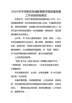12024年中学教改双减教育教学高质量发展工作总结经验做法在新时代,如何不断提高教育质量和育人水平,办人民满意的教育?如何培养具有正确人生观、价值观和世界观,拥有创新精神、实践能力和可持续发展能力的人?如何为孩子的终身发展和一生幸福奠基?课程改革、减负提质的重任永远在路上。近年来,市中在认真贯彻落实“双减”政策,一切以学生的健康成长为出发点,蓄力课堂,提质增效,在教学改革、教育科研、师资队伍建设等方面不断发力,教育质量持续攀升,社会满意度持续提高。在“双减”背景下,市中如何做到减负与增效同步、能力与成绩双增?上灵动而活泼的课“老师,关于这一段话,我还有一种理解,您看对不对。”一堂课结束,学生们...