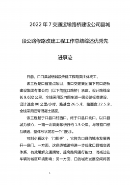 12022年7交通运输路桥建设公司县城段公路修路改建工程工作总结综述优秀先进事迹日前,口口县城绕城段改建工程路面主体完工。该工程是口省重点项目,由口交建集团旗下的口路桥建设集团有限公司(以下简称口路桥)承建,设计路线全长9.632公里,全线采用双向四车道一级公路标准建设,设计速度80公里/小时,路基宽26.5米,路面宽22.5米,全线采用沥青混凝土路面。该工程起于口县口村西口,终于口县口北口,以口县城为核心,一南一北皆向东绕行约1.5公里,与既有口相互联通,整体形状宛若一个门把手。可别小看这个‘门把手’,它将为口县的城市发展再开一扇门。一方面,这条绕城路将进一步优化口县城交通体系,有效缓解交通...