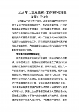 2023年以高质量统计工作服务高质量发展心得体会在党的二十大报告中指出,高质量发展是全面建设社会主义现代化国家的首要任务。推动高质量发展,必须完整准确全面贯彻新发展理念,加快构建新发展格局,着力促进产业升级和科技高水平自主可控,推动经济实现质的有效提升和量的合理增长。统计工作作为党中央治国理政的重要综合性基础性工作,要在服务高质量发展中更好发挥自身职能作用,为全面建设社会主义现代化国家开好局起好步贡献统计力量。坚定不移推动高质量发展 高质量发展是有效应对前进道路上风险挑战的必然要求。新中国成立后,我国在较短时间内建立了独立的比较完善的工业体系和国民经济体系。改革开放后,经过几十年的艰苦奋斗,我...