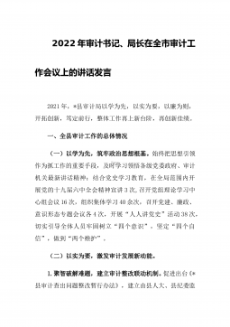 2022年审计书记、局长在全市审计工作会议上的讲话发言2021年,*县审计局以学为先,以实为要,以廉为则,开拓创新,笃定前行,整体工作再上新台阶,再创新佳绩。一、全县审计工作的总体情况(一)以学为先,筑牢政治思想根基。始终把思想引领作为抓工作的重要手段,及时学习领悟各级党委政府、审计机关最新讲话精神;结合党史学习教育,在全局范围内开展党的十九届六中全会精神宣讲3次,召开党组理论学习中心组会议16次,组织集体学习40余次,召开党建、廉政、意识形态专题会议各4次,开展“人人讲党史”活动38次,切实引导全体人员牢固树立“四个意识”,坚定“四个自信”,做到“两个维护”。(二)以实为要,激发审计发展新动...