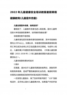 12022年儿童健康安全培训教案暑假寒假健康教育(儿童意外伤害)儿童出现意外伤害,如何应对?暑假到了,儿童意外伤害也进入高发期。面对儿童常见的6种非故意伤害事件,如何做好急救处理?非故意伤害不容忽视儿童伤害包括非故意伤害和故意伤害,其中非故意伤害约占95%以上。长期以来,非故意伤害因其高致残和高死亡率已成为全球公共卫生的重点关注领域。与成年人相比,儿童和青少年遭受伤害的风险更高,《中国儿童发展纲要(2021-2030年)》将儿童伤害的预防与救治列为主要目标之一。儿童非故意伤害如何应对1溺水在我国,溺水位于儿童致死原因的前两位,其致死率和致残率很高,造成严重的家庭和社会负担。淹溺时间的长短和从抢...