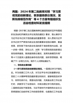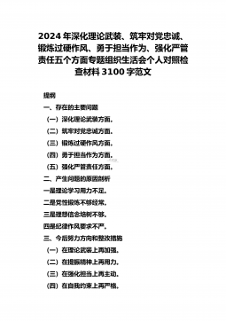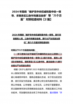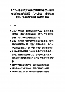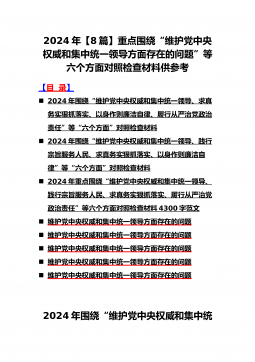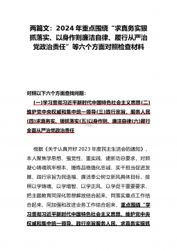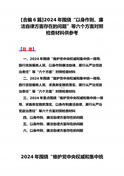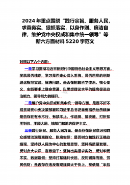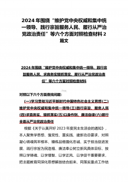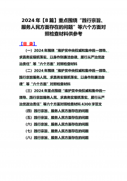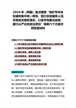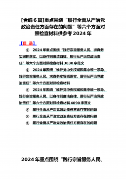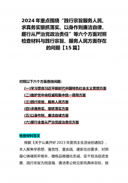 2024年重点围绕“践行宗旨服务人民、求真务实狠抓落实、以身作则廉洁自律、履行从严治党政治责任”等六个方面对照检查材料与践行宗旨、服务人民方面存在的问题【15篇】对照以下六个方面查找问题:(一)学习贯彻习近平新时代中国特色社会主义思想方面(二)维护党中央权威和集中统一领导方面(三)践行宗旨、服务人民方面(四)求真务实、狠抓落实方面(五)以身作则、廉洁自律方面(六)履行全面从严治党政治责任方面检查材料范文根据《关于认真开好2023年度民主生活会的通知》,本人聚焦学思想、强党性、重实践、建新功总要求,对照凝心铸魂筑牢根本、锤炼品格强化忠诚、实干担当促进发展、践行宗旨为民造福、廉洁奉公树立新风具体目...
