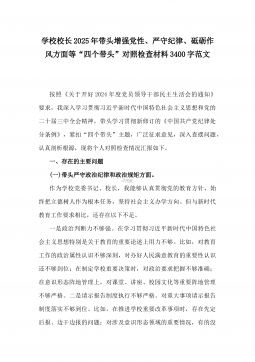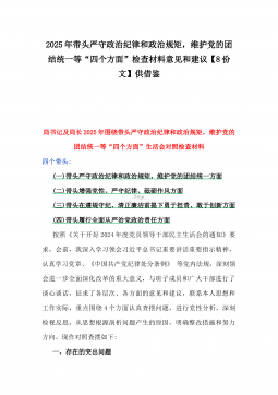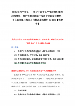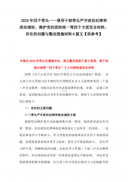 2025年带头增强党性、严守纪律、砥砺作风等方面检查材料(四个带头)含违纪行为为典型案例的举一反三剖析对照检查材料【11篇word版例文】供参考(一)在带头严守政治纪律和政治规矩,维护党的团结统一方面。(二)在带头增强党性、严守纪律、砥砺作风方面。(三)在带头在遵规守纪、清正廉洁前提下勇于担责、敢于创新方面。(四)在带头履行全面从严治党政治责任方面。(五)围绕本领域违纪行为典型案例剖析。目录1.2025年“四个带头”对照检查剖析材料例文(含财产未申报检讨、反思典型案例)2.2025年“四个带头”对照检查材料(含本领域反面违纪典型案例剖析)3.2025年对照个人检查材料5830字稿(四个带头)4...