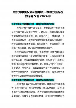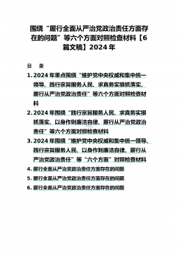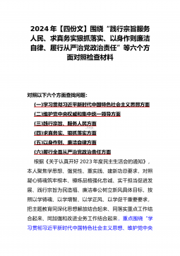 【4篇】2024年重点围绕“维护党中央权威和集中统一领导、践行宗旨服务人民、求真务实狠抓落实、以身作则廉洁自律、履行从严治党政治责任”等“六个方面”对照检查材料对照以下六个方面查找问题(一)学习贯彻习近平新时代中国特色社会主义思想方面(二)维护党中央权威和集中统一领导方面(三)践行宗旨、服务人民方面(四)求真务实、狠抓落实方面(五)以身作则、廉洁自律方面(六)履行全面从严治党政治责任方面检查材料范文根据《关于认真开好2023年度民主生活会的通知》,本人聚焦学思想、强党性、重实践、建新功总要求,对照凝心铸魂筑牢根本、锤炼品格强化忠诚、实于担当促进发展、践行宗旨为民造福、廉洁奉公树立新风具体目标,...