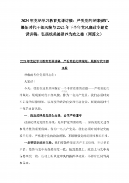 2024年党纪学习教育党课讲稿:学党纪筑牢规矩“防火墙”,心存敬畏,使守纪律、讲规矩成为行动自觉与下半年党风廉政专题党课讲稿:坚持实在实干实绩助推党风廉政建设各位党员【2篇文】2024年党纪学习教育党课讲稿:学党纪筑牢规矩“防火墙”,心存敬畏,使守纪律、讲规矩成为行动自觉同志们:经党中央同意,自2024年4月至7月在全党开展党纪学习教育。这次党纪学习教育,是加强党的纪律建设、推动全面从严治党向纵深发展的重要举措。心有所戒,行有所止。作为党员干部,不管在什么岗位,都应当把纪律挺在前面,时刻绷紧纪律之弦、筑牢作风之堤,在讲规矩中干好事、在守纪律中干成事,把遵守党的政治纪律和政治规矩落实到自己的全部...