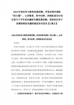 2024年党纪学习教育党课讲稿:学党纪筑牢规矩“防火墙”,心存敬畏,使守纪律、讲规矩成为行动自觉与下半年党风廉政专题党课讲稿:坚持实在实干实绩助推党风廉政建设各位党员【2篇文】