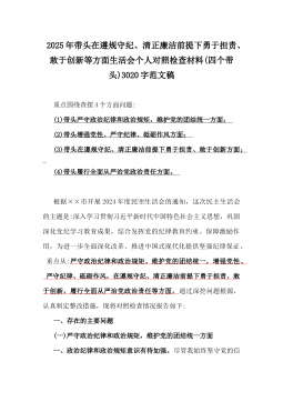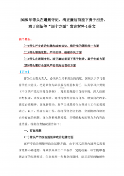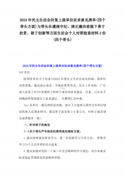 市检察院党组成员、政治部主任2025年民主生活会“四个带头”个人对照检视发言材料【含以案为鉴,深刻剖析自身问题方面】与对照材料(四个带头+保密工作职责)2篇例文市检察院党组成员、政治部主任2025年民主生活会“四个带头”个人对照检视发言材料【含以案为鉴,深刻剖析自身问题方面】根据市委《关于召开2024年度民主生活会的通知》有关要求,我紧紧围绕本次民主生活会主题,结合主管政治部,协助常务副检察长分管办公室、计划财务装备部等工作职责,认真对照“四个带头”,全面深入查摆了工作中存在的突出问题,认真分析了问题产生的原因,逐项明确了下一步整改措施。按照会议安排,现将对照检查情况汇报如下。一、学习贯彻习近...