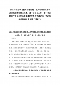 2024年党纪学习教育党课讲稿:把严明政治纪律和政治规矩摆在突出位罩,进一步正心正行,做一名合格共产党员与推动高质量发展专题党课讲稿:推动县域经济高质量发展(2篇文)