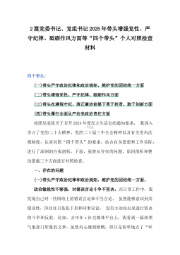 四个带头:2025年带头增强党性、严守纪律、砥砺作风、严守政治纪律和政治规矩,维护党的团结统一等发言材料、存在的问题及整改措施努力方向【6篇】供参考2025年专题生活会对照带头增强党性、严守纪律、砥砺作风等“四个带头方面”个人对照检查发言材料“四个带头方面”(一)带头严守政治纪律和政治规矩,维护党的团结统一方面(二)带头增强党性、严守纪律、砥砺作风方面(三)带头在遵规守纪、清正廉洁前提下勇于担责、敢于创新方面(四)带头履行全面从严治党政治责任方面【正文】根据关于开好2024年度民主生活会有关精神,聚焦四个方面深入查找存在问题和不足,深刻分析问题产生的原因,明确今后努力的方向和整改措施。现作对照...