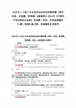 2024年二十届三中全会应知应会知识测试题(填空、单选、多选题、简答题)&最新修订2024年《中国共产党纪律处分条例》考试题(单项、多项选择题共70题)两套汇编【附:答案解析】供参考2024年二十届三中全会应知应会知识测试题(填空、单选、多选题、简答题)【附:全部答案】供参考一、填空题1.当前和今后一个时期是以中国式现代化()的关键时期。答案:全面推进强国建设、民族复兴伟业2.到()年中华人民共和国成立时(),完成本决定提出的改革任务。答案:2029八十周年3.到二0三五年,()高水平社会主义市场经济体制,中国特色社会主义制度(),()国家治理体系和治理能力现代化,社会主义现代化,为到()全面...