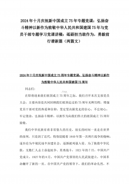 2024年十月庆祝新中国成立75年专题党课:弘扬奋斗精神以新作为致敬中华人民共和国建国75年与党员干部专题学习党课讲稿:砥砺担当敢作为,勇毅前行谱新篇(两篇文)