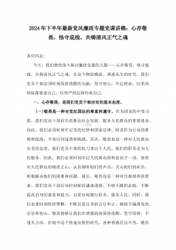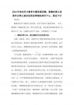 2024年党纪学习教育党课讲稿文:“六大纪律”专题党课与深入学习贯彻新修订的《中国共产党纪律处分条例》,将纪律要求内化于心外化于行(2篇)供参考2024年党纪学习教育党课讲稿文:“六大纪律”专题党课同志们:本次党纪学习教育强调要抓住学习重点,在学习贯彻《中国共产党纪律处分条例》上下功夫见成效。作为规范党组织和党员行为的基础性法规,《条例》在党内法规体系中发挥着重要作用。2023年对《条例》进行修订,是促进全党深刻领悟“两个确立”的决定性意义、坚决做到“两个维护”的必然要求,是坚持问题导向、用严明的纪律管全党治全党的现实需要,是总结从严管党治党经验、实现与时俱进的实践要求。开展好党纪学习教育,要...