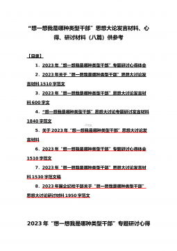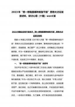 2023年“想一想我是哪种类型干部”思想大讨论发言材料、研讨心得(十篇)word版2023年国企纪检干部关于“想一想我是哪种类型干部”思想大讨论研讨材料根据xx有限公司党委《关于深入开展“想一想我是哪种类型干部”思想大讨论活动的通知》文件精神,聚焦陈刚书记提出的“干部要干、思路要清、律己要严”的工作要求,对照集团公司改革发展思路,作为一名基层纪检干部,要始终以党性立身,秉公执纪、谨慎用权,敢于善于斗争,以扎扎实实的履职行动,践行新时代好干部标准,切实把工作干得更好、更出彩。一、“想一想我是哪种类型的干部”的思考习近平总书记在二十届中央纪委二次全会上强调,“纪检监察机关是推进全面从严治党的重要力...
