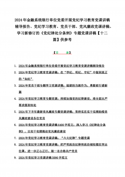 2024年金融系统银行单位党委开展党纪学习教育党课讲稿辅导报告、党纪学习教育、党员干部、党风廉政党课讲稿、学习新修订的《党纪律处分条例》专题党课讲稿【十二篇】供参考【目录】1.2024年金融系统银行单位党委开展党纪学习教育党课讲稿辅导报告2.2024年党纪学习教育党课讲稿:在“学纪、明纪、守纪”中做到真正的“知纪”3.2024年党员干部专题学习党课讲稿:砥砺担当敢作为,勇毅前行谱新篇4.2024年党纪学习教育专题党课:持续加强党的纪律建设,将全面从严要求落到实处5.2024年下半年最新党风廉政专题党课讲稿:坚持实在实干实绩助推党风廉政建设各位党员6.2024年党纪学习教育党课讲稿6400字范文...