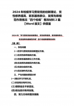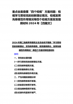 四个检视——2024年“检视联系服务群众,学习贯彻党的创新理论、看为身边群众做了什么实事好事,还有哪些差距、检视发挥先锋模范作用情况”等方面对照检查材料4篇文个人围绕“检视学习贯彻党的创新理论,检视党性修养提高,检视联系服务群众,检视发挥先锋模范作用情况”等四个检视方面材料提纲:一、存在问题(一)检视学习贯彻党的创新理论情况(二)检视党性修养提高情况(三)检视联系服务群众情况(四)检视发挥先锋模范作用情况二、原因剖析(一)主观世界改造不彻底。(二)宗旨意识还需提升。(三)理想信念有所下滑。(四)党性修养有所懈怠。三、整改措施(一)强化理论武装。(二)把牢政治方向。(三)深化从严治党。(四)开展...