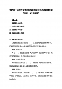 党的二十大报告精神应知应会知识竞赛测试题附答案【后附:80选择题】目录一、填空题(50题)二、单项选择题(30题)三、简答题(10题)四、风险论述题(1题)一、填空题(50题)1.增强党组织政治功能和(),坚持大抓基层的鲜明导向,把基层党组织建设成为有效实现党的领导的坚强战斗堡垒。答案:组织功能2.()是国家治理的一场深刻革命,关系党执政兴国,关系人民幸福安康,关系党和国家长治久安。答案:全面依法治国3.必须更好发挥法治()、稳预期、利长远的保障作用,在法治轨道上全面建设社会主义现代化国家。答案:固根本4.坚持法治国家、法治政府、()一体建设,全面推进科学立法、严格执法、公正司法、全民守法,全...