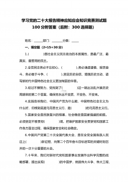 学习党的二十大报告精神应知应会知识竞赛测试题100分附答案(后附:300选择题)姓名:部门:分数:一、填空题(2×15=30分)1.()是社会主义民主政治的本质属性,是最广泛、最真实、最管用的民主。2.全党同志务必不忘初心、(),务必谦虚谨慎、艰苦奋斗,务必敢于斗争、(),坚定历史自信,增强历史主动,谱写新时代中国特色社会主义更加绚丽的华章。3.经过不懈努力,党找到了()这一跳出治乱兴衰历史周期率的第二个答案,确保党永远不变质、不变色、不变味。4.实践告诉我们,中国共产党为什么能,中国特色社会主义为什么好,归根到底是马克思主义行,是()的马克思主义行。5.国家安全是民族复兴的根基,社会稳定是国...