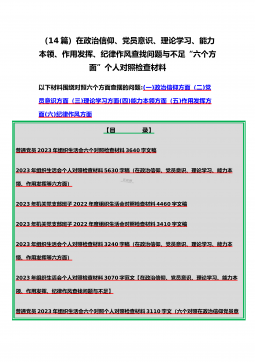 (14篇)在政治信仰、党员意识、理论学习、能力本领、作用发挥、纪律作风查找问题与不足“六个方面”个人对照检查材料以下材料围绕对照六个方面查摆的问题:(一)政治信仰方面(二)党员意识方面(三)理论学习方面(四)能力本领方面(五)作用发挥方面(六)纪律作风方面【目录】普通党员2023年组织生活会六个对照检查材料3640字文稿2023年组织生活会个人对照检查材料5630字稿(在政治信仰、党员意识、理论学习、能力本领、作用发挥等六方面)2023年机关党支部班子2022年度组织生活会对照检查材料4460字文稿2023年机关党支部班子2022年度组织生活会对照检查材料3410字文稿2023年组织生活会个人...
