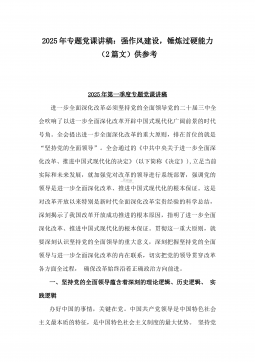2025年专题党课讲稿:强作风建设,锤炼过硬能力(2篇文)供参考2025年第一季度专题党课讲稿进一步全面深化改革必须坚持党的全面领导党的二十届三中全会吹响了以进一步全面深化改革开辟中国式现代化广阔前景的时代号角。全会提出进一步全面深化改革的重大原则,排在首位的就是“坚持党的全面领导”。全会通过的《中共中央关于进一步全面深化改革、推进中国式现代化的决定》(以下简称《决定》),立足当前实际和未来发展,就加强党对改革的领导进行系统部署,强调党的领导是进一步全面深化改革、推进中国式现代化的根本保证。这是对改革开放以来特别是新时代全面深化改革宝贵经验的科学总结,深刻揭示了我国改革开放成功推进的根本原因,...