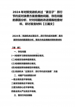 2024年对照党政机关过“紧日子”厉行节约反对浪费方面查摆的问题、存在问题的原因分析、针对问题的改进措施检查材料、研讨发言材料【三篇文】