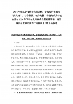 2024年党纪学习教育党课讲稿:学党纪筑牢规矩“防火墙”,心存敬畏,使守纪律、讲规矩成为行动自觉与2024年下半年党风廉政专题党课讲稿:清正廉洁做表率忠诚笃行树新风【2篇】供参考