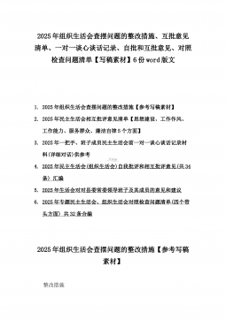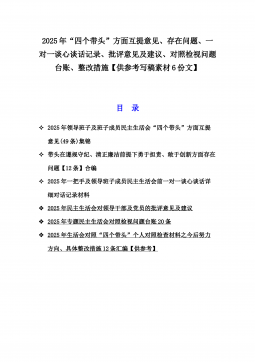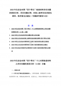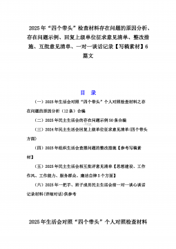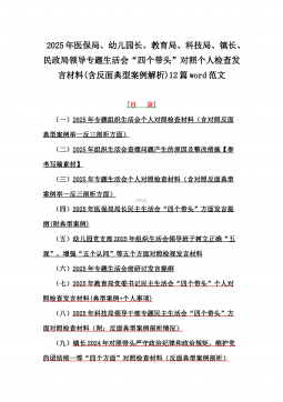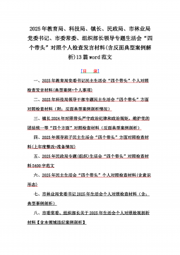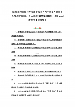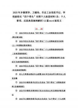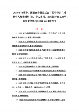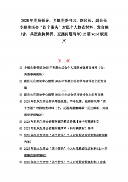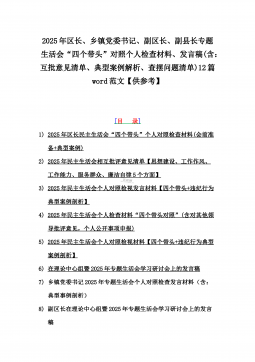 2025年区长、乡镇党委书记、副区长、副县长专题生活会“四个带头”对照个人检查材料、发言稿(含:互批意见清单、典型案例解析、查摆问题清单)12篇word范文【供参考】[目录]1)2025年区长民主生活会“四个带头”个人对照检查材料(会前准备+典型案例)2)2025年民主生活会相互批评意见清单【思想建设、工作作风、工作能力、服务群众、廉洁自律5个方面】3)2025年民主生活会个人对照检视发言材料【四个带头+违纪行为典型案例剖析】4)2025年民主生活会个人检查材料“四个带头对照”(含对其他领导批评意见,个人公开事项申报)5)2025年民主生活会个人对照检视材料【四个带头+违纪行为典型案例剖析】6...