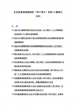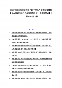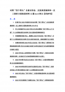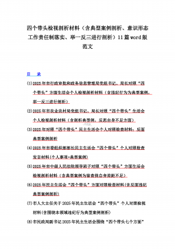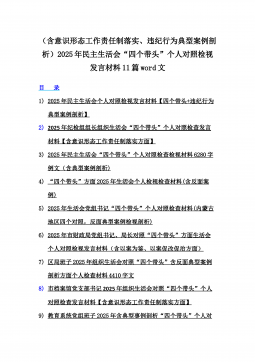 (含意识形态工作责任制落实、违纪行为典型案例剖析)2025年民主生活会“四个带头”个人对照检视发言材料11篇word文目录1)2025年民主生活会个人对照检视发言材料【四个带头+违纪行为典型案例剖析】2)2025年纪检组组长组织生活会“四个带头”个人对照检查发言材料【含意识形态工作责任制落实方面】3)2025年民主生活会“四个带头”个人对照检查检视材料6280字例文(含典型案例剖析)4)“四个带头”方面2025年生活会个人检视检查材料(含反面案例)5)2025年生活会党组书记“四个带头”个人对照检查材料(内蒙古地区四个对照,反面典型案例检视剖析)6)2025年市财政局党组书记、局长对照“四个带...