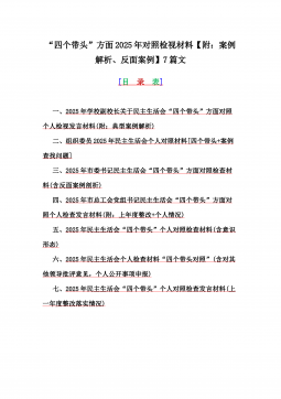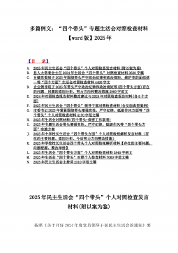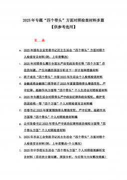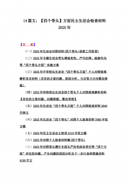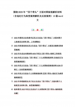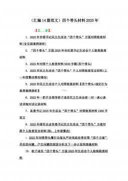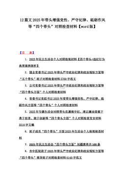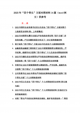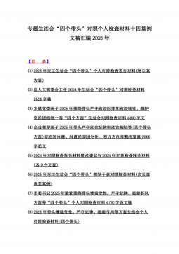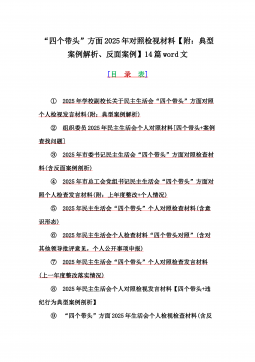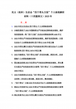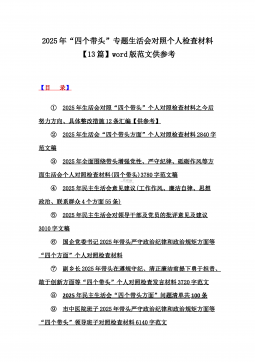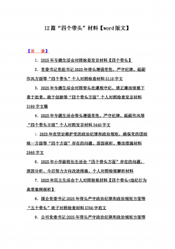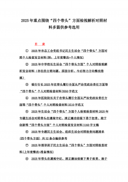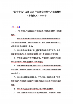 2025年专题生活会带头增强党性、严守纪律、砥砺作风等“四个带头”对照个人检查材料【13篇word版文稿】【目录】1)2025年民主生活会“四个带头方面”问题清单共100条2)市中医院班子2025年带头严守政治纪律和政治规矩方面等“四个带头”领导班子对照检查材料6140字范文3)企业领导班子2025年带头严守政治纪律和政治规矩等(四个带头方面)存在的问题、原因分析、努力方向和整改措施5280字范文4)局书记局长2025年围绕带头严守政治纪律和政治规矩,维护党的团结统一等“四个方面”生活会对照检查材料3340字文5)2025年民主生活会“四个带头”个人对照检查发言材料(上一年度整改落实情况)6)...