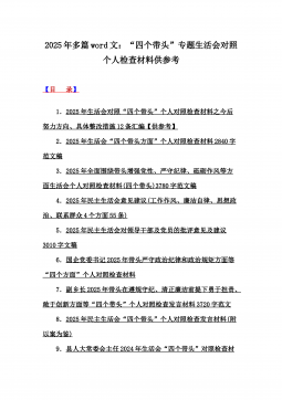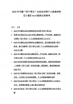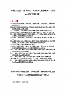 十三篇例文:带头严守政治纪律和政治规矩方面等“四个带头”专题生活会对照检查材料【word版】2025年【目录】一、2025年生活会对照材料(四个带头+保密工作职责)二、2025年专题生活会带头增强党性、严守纪律、砥砺作风等“四个带头方面”实施方案三、2025年中学校长生活会“四个带头方面”个人对照检视解析发言材料(存在的主要问题、原因分析、今后努力方向整改措施)四、2025年学校校长生活会四个带头个人对照检视解析材料【存在的主要问题、问题根源、整改举措】五、2025年生活会“四个带头方面”个人对照检查材料3840字例文六、2025年生活会“四个带头”对照个人检查材料7060字范文稿七、2025...