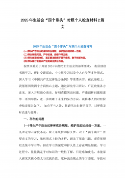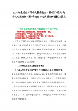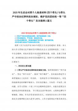 2025年生活会“四个带头”个人对照检查发言材料(附以案为鉴)与2025年企业领导班子带头严守政治纪律和政治规矩等“五个方面”存在的问题、原因分析、整改措施2025年民主生活会“四个带头”个人对照检查发言材料(附以案为鉴)按照《关于开好2024年度党员领导干部民主生活会的通知》要求,会前,本人深入学习领会习近平总书记重要讲话重要指示精神,认真学习党章、《条例》等党内法规,深刻领会进一步全面深化改革的重大意义,通过与班子成员和广大干部进行了谈心谈话,征求了各层次、各方面的意见和建议,重点围绕5个方面认真查摆问题,进行党性分析,深刻检视反思,从思想根源剖析问题产生的原因,明确整改措施和努力方向。现...