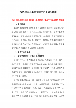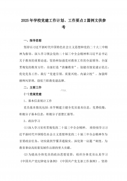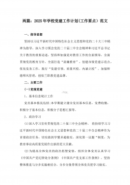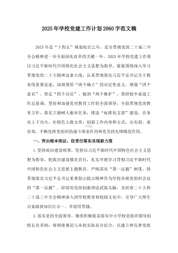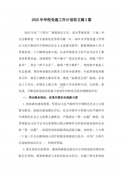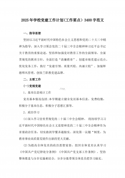 2025年学校党建工作计划【总体思路、工作目标、工作内容、具体措施、保障措施】范文稿一、总体思路2025年是“十四五”规划收官之年,是全面贯彻党的二十届三中全会精神进一步全面深化改革的关键一年。2025年学校党建工作将以习近平新时代中国特色社会主义思想为指导,紧紧围绕深入学习贯彻党的二十大精神这条主线,认真贯彻落实习近平总书记关于教育的重要论述,深刻领悟“两个确立”的决定性意义,增强“四个意识”、坚定“四个自信”、做到“两个维护”,坚持稳中求进工作总基调,坚持和加强党对教育工作的全面领导,全面贯彻党的教育方针,落实立德树人根本任务,推进“标准化支部”建设,在务实上下功夫,在特色上做文章,创新工...