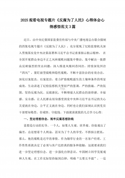 2025年观看直播反腐电视专题片《反腐为了人民》感悟心得6篇范文观看《反腐为了人民》心得体会通过观看反腐电视专题片《反腐为了人民》,深受教育和启示,深刻认识到发扬彻底的自我革命精神的重要性、必要性,作为县住建局的党政主要负责人,一定要在管党治党上狠下功夫,把管党治党政治责任扛在肩上、落到实处,为建设双“50”现代化中等城市而不懈奋斗。为此,我将切实做到以下几点:一是坚定信念守住初心。始终加强政治理论和法纪法规的学习,坚持用习近平新时代中国特色社会主义思想武装头脑,指导实践,推动工作。用理论拓宽思路、创新方法、推动落实,在项目建设、住房保障、工程改革等领域增强政治定力、把握正确方向。二是心存敬畏...