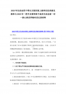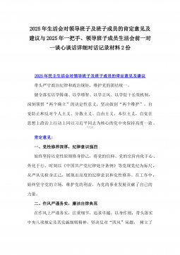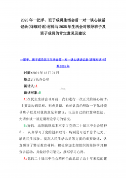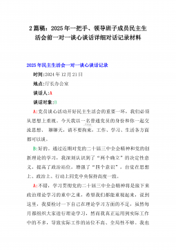 2025年一把手、领导班子成员民主生活会前一对一谈心谈话详细对话记录材料2份与2025年对照“四个带头”个人对照检查材料之今后努力方向、具体整改措施12条2025年民主生活会一对一谈心谈话记录时间:2024年12月21日地点:厅长办公室谈话人:A谈话对象:BA:党员谈心活动开好民主生活会的重要一环,我们必须从思想上重视。今天我以一名普通党员的身份和你一起交流思想、聊聊天,请不要拘束,工作、学习、生活各方面都可以谈。B:好的。通过近期对党的二十届三中全会精神和党的创新理论的学习,我深刻认识到了“两个确立”的决定性意义,提高了政治站位,增强了“四个意识”,自觉在思想上、政治上、行动上同党中央保持高...