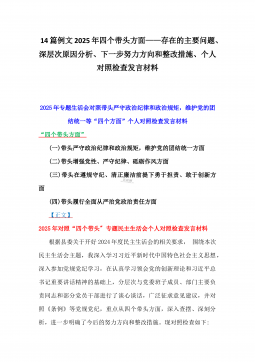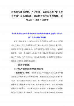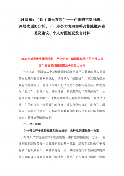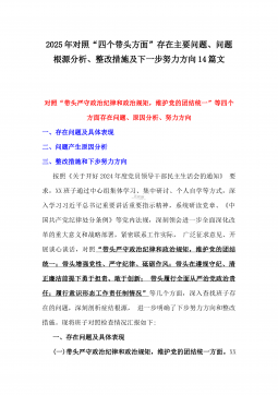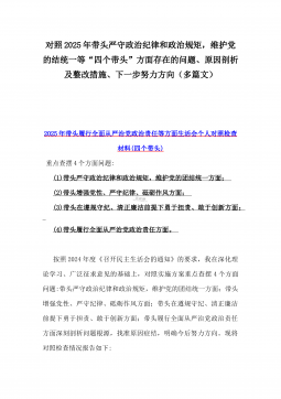 2025年对照“带头严守政治纪律和政治规矩,维护党的团结统一”等四个方面存在的意见、建议、问题、原因分析、整改措施、今后努力方向【14篇文】2025年对照“带头严守政治纪律和政治规矩,维护党的团结统一”等四个方面存在的意见、建议、问题、原因分析、整改措施、今后努力方向【14篇文】2025年对照“带头严守政治纪律和政治规矩,维护党的团结统一”等四个方面存在的意见、建议、问题、原因分析、整改措施、今后努力方向【14篇文】