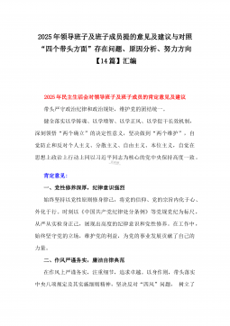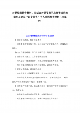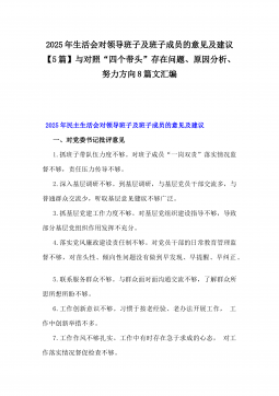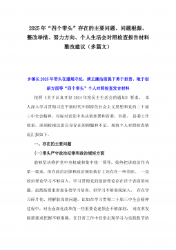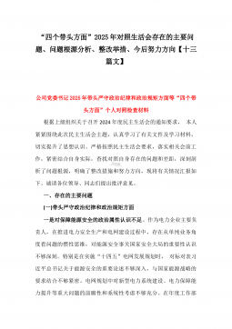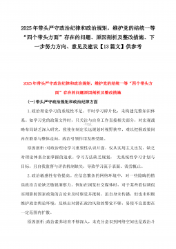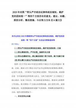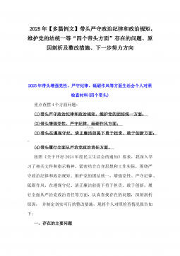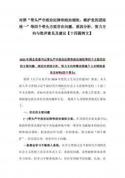2025年对照“带头严守政治纪律和政治规矩,维护党的团结统一”等四个方面存在的意见、建议、问题、原因分析、整改措施、今后努力方向【14篇文】局书记局长2025年围绕带头严守政治纪律和政治规矩,维护党的团结统一等“四个方面”生活会对照检查材料四个带头:(一)带头严守政治纪律和政治规矩,维护党的团结统一方面(二)带头增强党性、严守纪律、砥砺作风方面(三)带头在遵规守纪、清正廉洁前提下勇于担责、敢于创新方面(四)带头履行全面从严治党政治责任方面按照《关于开好2024年度党员领导干部民主生活会的通知》要求,会前,我深入学习领会习近平总书记重要讲话重要指示精神,认真学习党章、《中国共产党纪律处分条例》等...