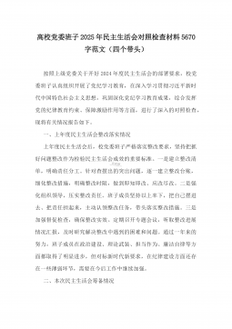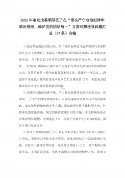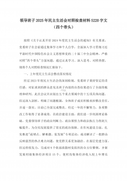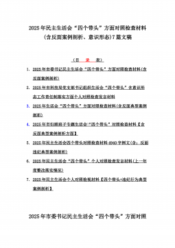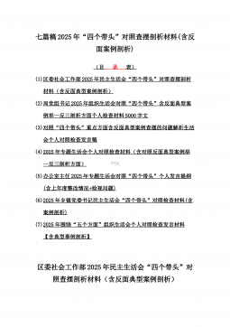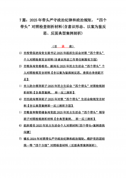 7篇:2025年带头严守政治纪律和政治规矩,“四个带头”对照检查剖析材料(含意识形态、以案为鉴反思、反面典型案例剖析)(目录表)1)市投资促进局党支部书记2025年组织生活会对照“四个带头”个人对照检查发言材料(含意识形态工作责任制落实方面)2)市税务局党委委员,副局长2025年民主生活会“四个带头”个人对照检视发言材料【含以案为鉴深刻反思,查找自身差距不足】3)市人防办领导班子2025年民主生活会“四个带头”对照检视剖析材料【含典型案例,举一反三剖析】4)市民政局领导班子2025年对照“四个带头”生活会检视发言材料【含以典型案例举一反三剖析方面】5)市粮食和物资储备局党组2025年民主生活会...