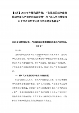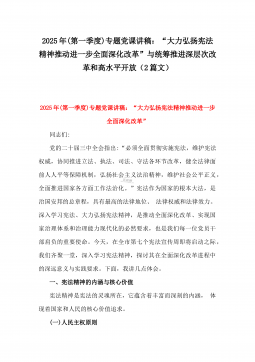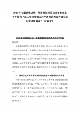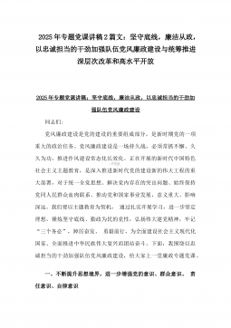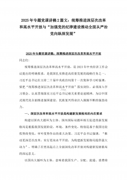 2025年专题党课讲稿:强作风建设,锤炼过硬能力(2篇文)供参考2025年第一季度专题党课讲稿进一步全面深化改革必须坚持党的全面领导党的二十届三中全会吹响了以进一步全面深化改革开辟中国式现代化广阔前景的时代号角。全会提出进一步全面深化改革的重大原则,排在首位的就是“坚持党的全面领导”。全会通过的《中共中央关于进一步全面深化改革、推进中国式现代化的决定》(以下简称《决定》),立足当前实际和未来发展,就加强党对改革的领导进行系统部署,强调党的领导是进一步全面深化改革、推进中国式现代化的根本保证。这是对改革开放以来特别是新时代全面深化改革宝贵经验的科学总结,深刻揭示了我国改革开放成功推进的根本原因,...